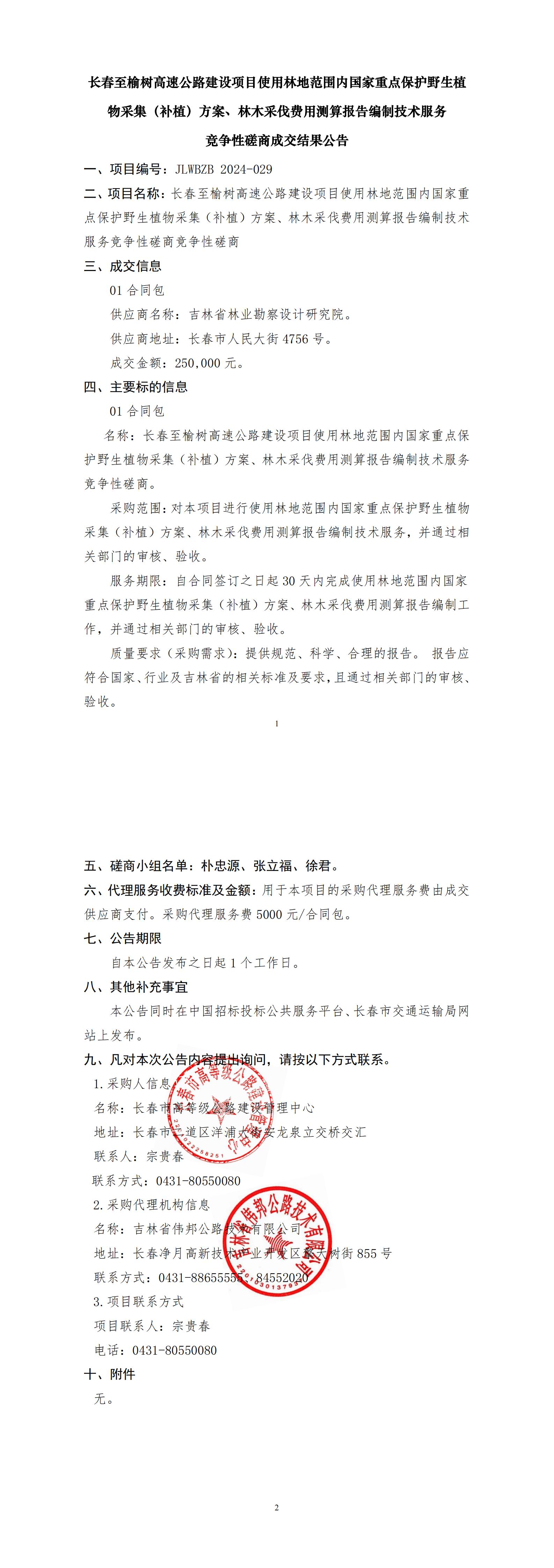 长春至榆树高速公路建设项目使用林地范围内国家重点保护野生植物采集(补植)方案、林木采伐费用测算报告编制技术服务竞争性磋商成交结果公告