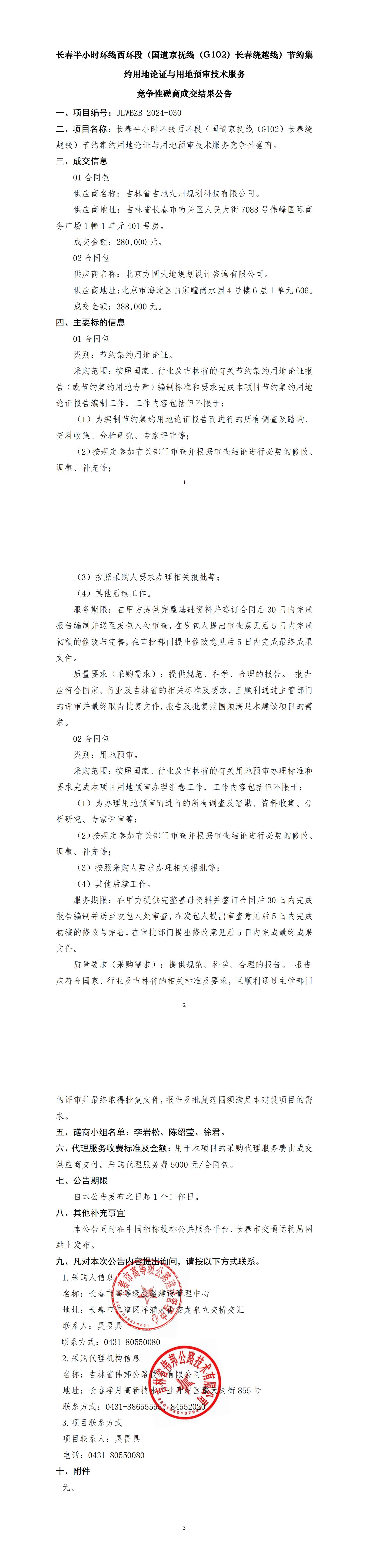 长春半小时环线西环段(国道京抚线(G102)长春绕越线)节约集约用地论证与用地预审技术服务竞争性磋商成交结果公告