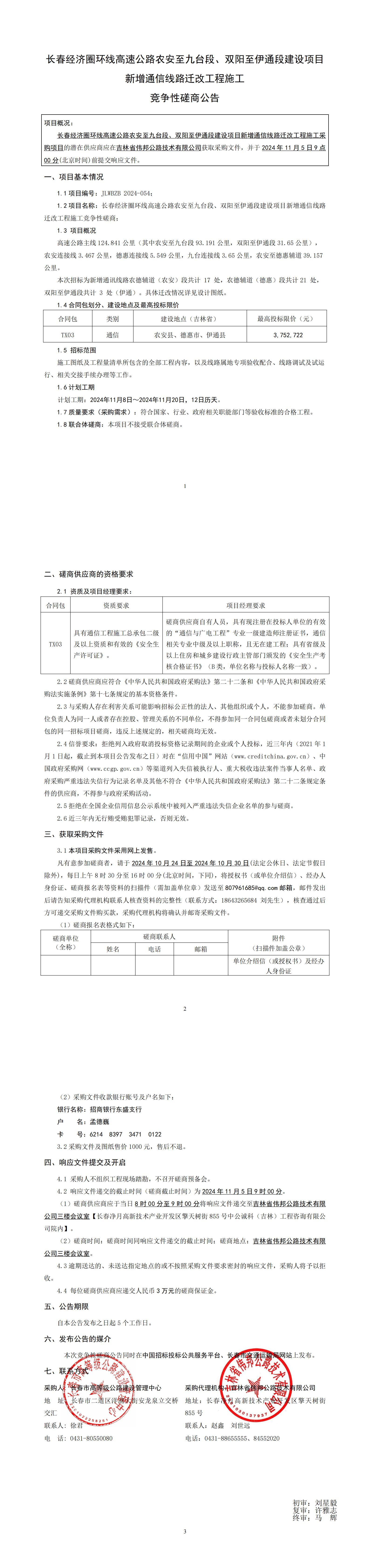 长春经济圈环线高速公路农安至九台、双阳至伊通段建设项目新增通信线路迁改工程施工竞争性磋商公告