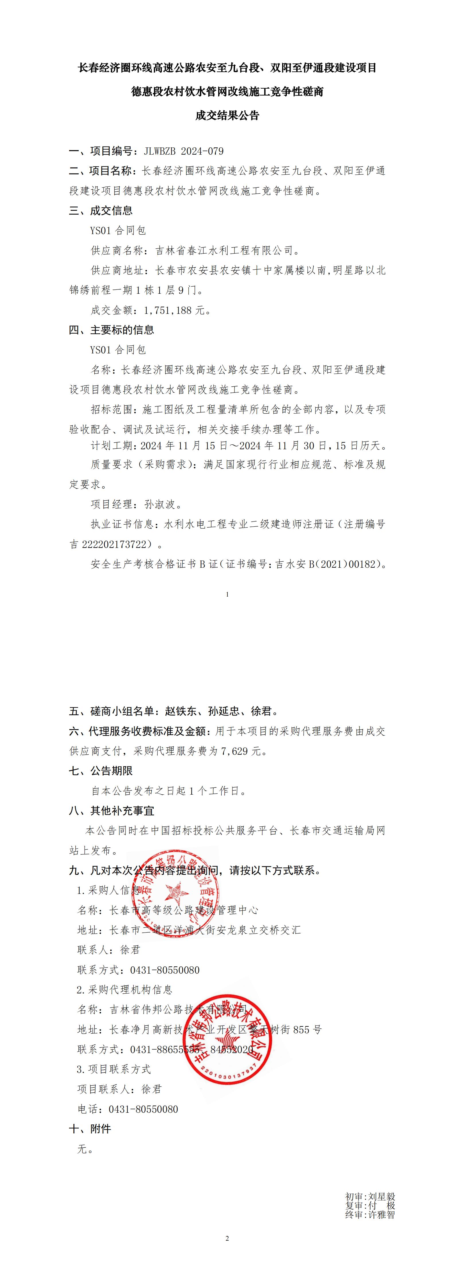 长春经济圈环线高速公路农安至九台段、双阳至伊通段建设项目德惠段农村饮水管网改线施工竞争性磋商成交结果公告
