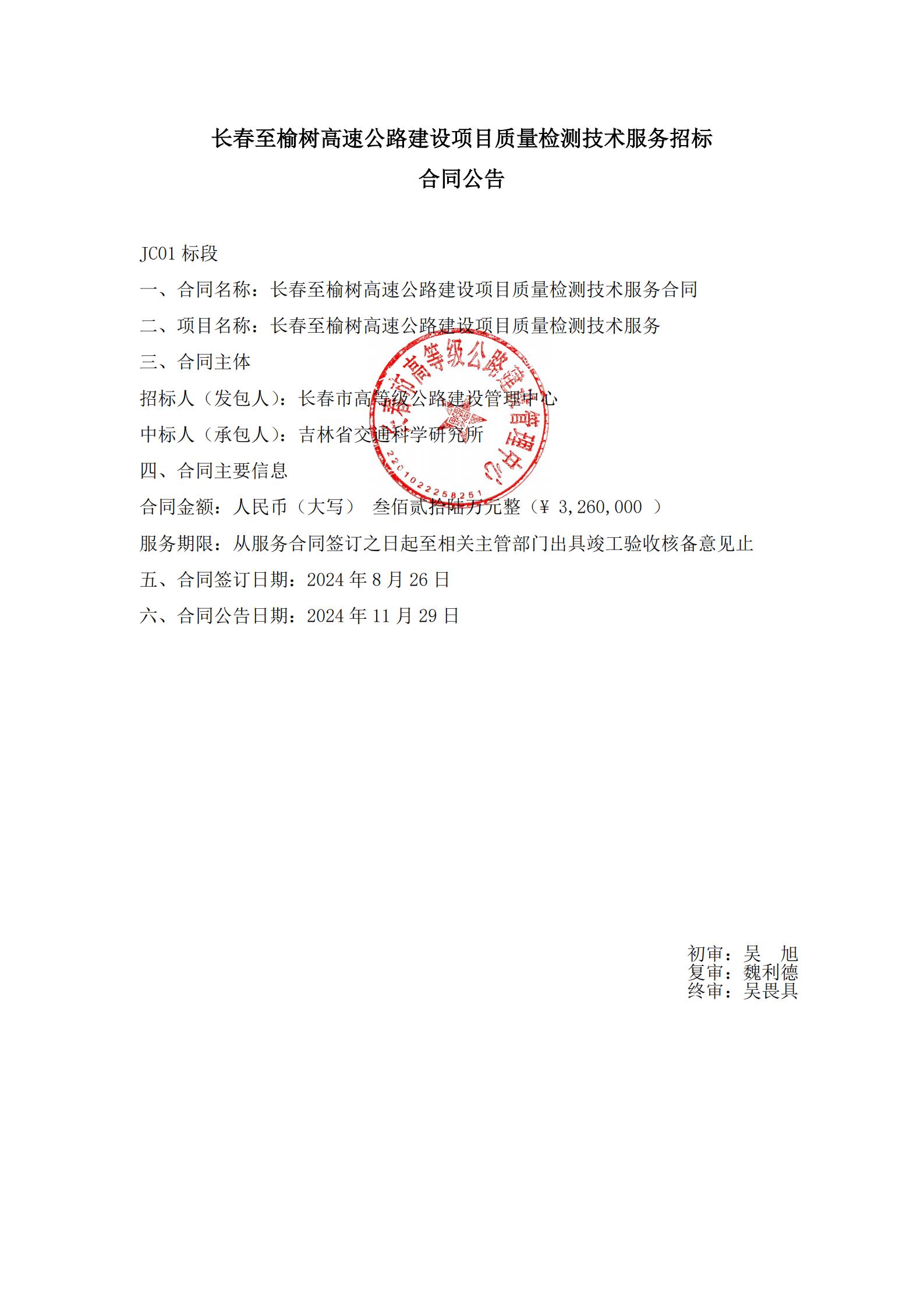 长春至榆树高速公路建设项目质量检测技术服务招标合同公告