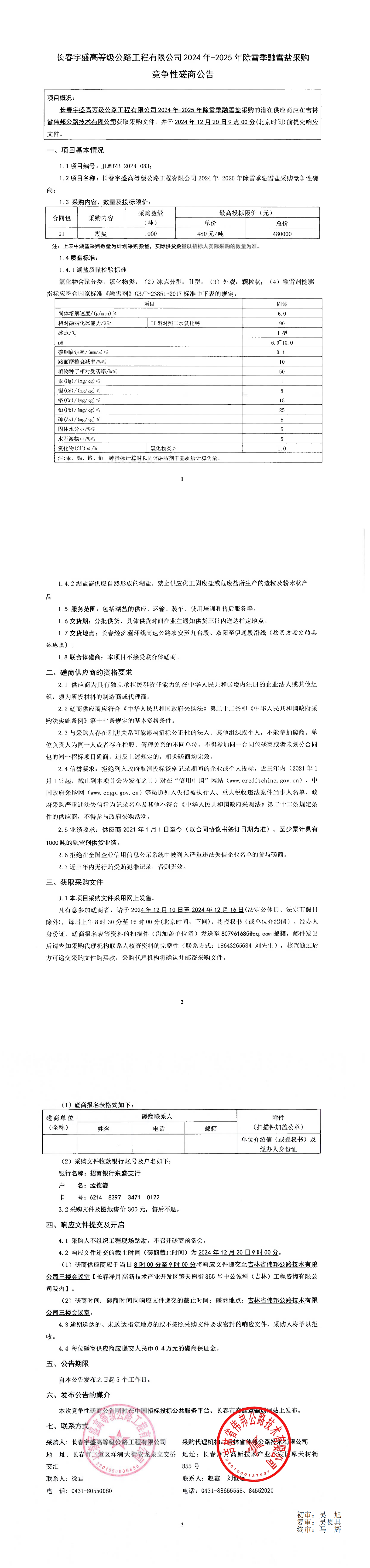长春宇盛高等级公路工程有限公司2024年-2025年除雪季融雪盐采购竞争性磋商公告