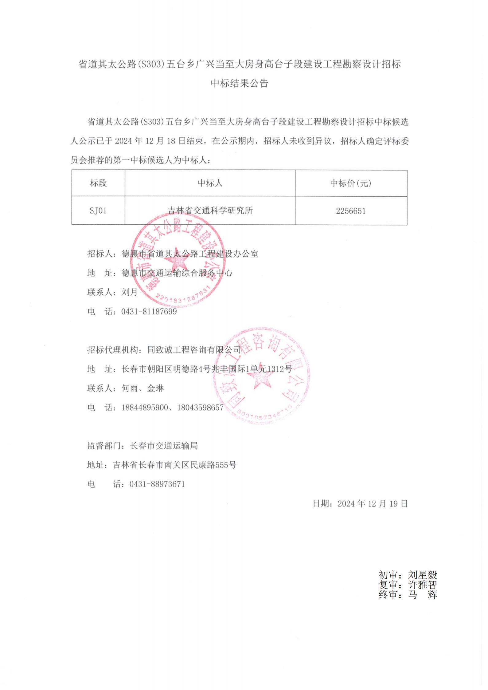 省道其太公路(S303)五台乡广兴当至大房身高台子段建设工程勘察设计招标中标结果公告