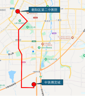 线路由中铁博览城始发,途经前进大街、延安大街,终到朝阳区第二中医院,可与轨道3、6号线衔接,全程17公里,配车20台,首末车时间5:30-21:45,车隔时间6-15分钟。线路依托202路改造,开通后202路停运。