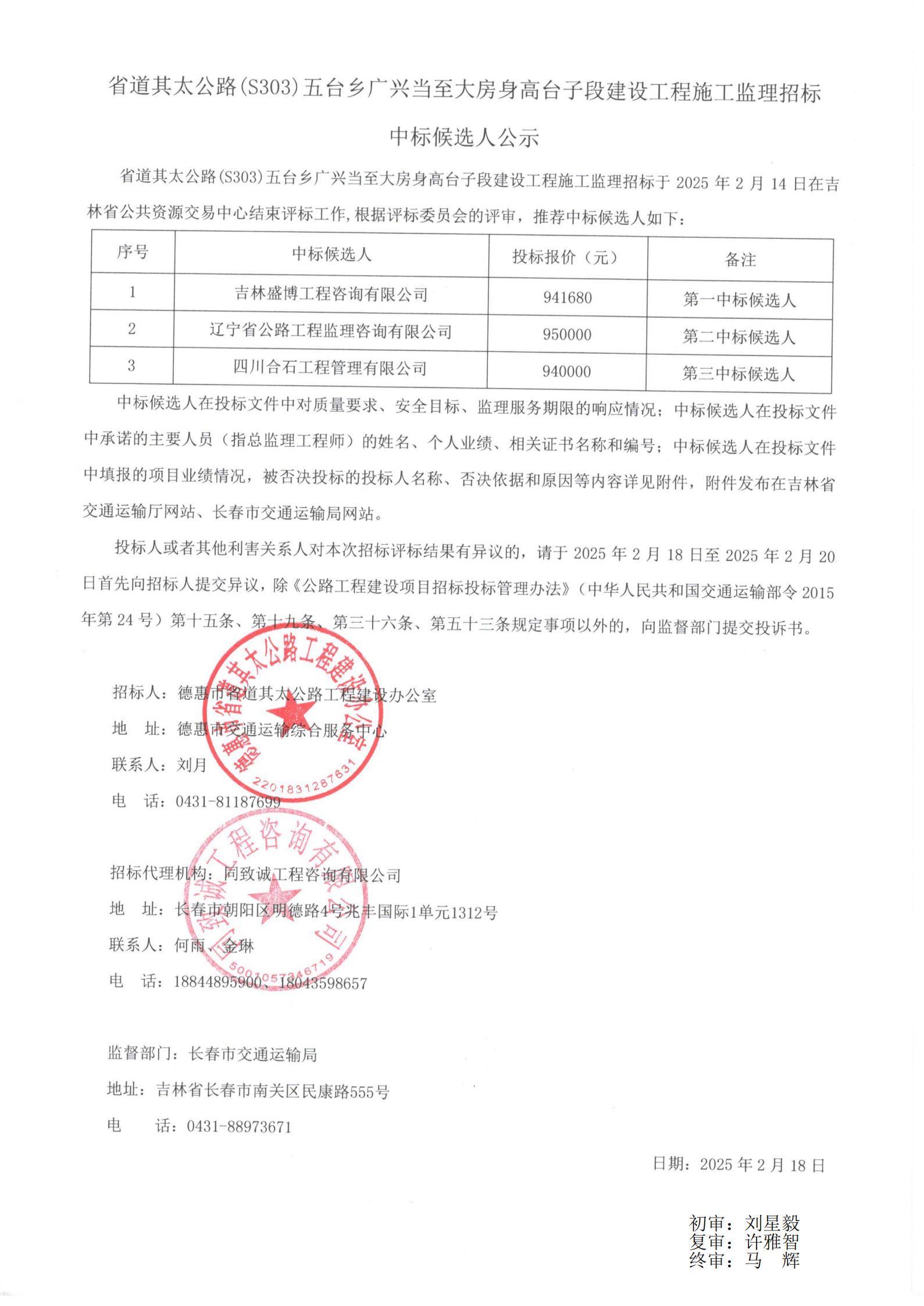 附件:省道其太公路(S303)五台乡广兴当至大房身高台子段建设工程施工监理招标中标候选人公示(附件内容).docx