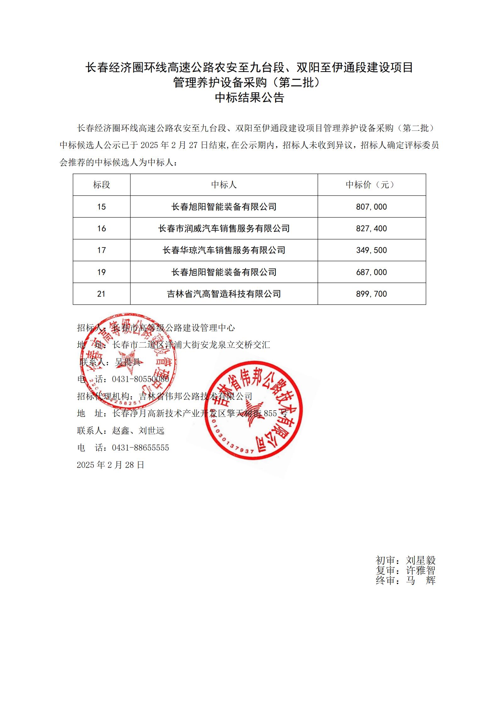 长春经济圈环线高速公路农安至九台段、双阳至伊通段建设项目管理养护设备采购(第二批)中标结果公告