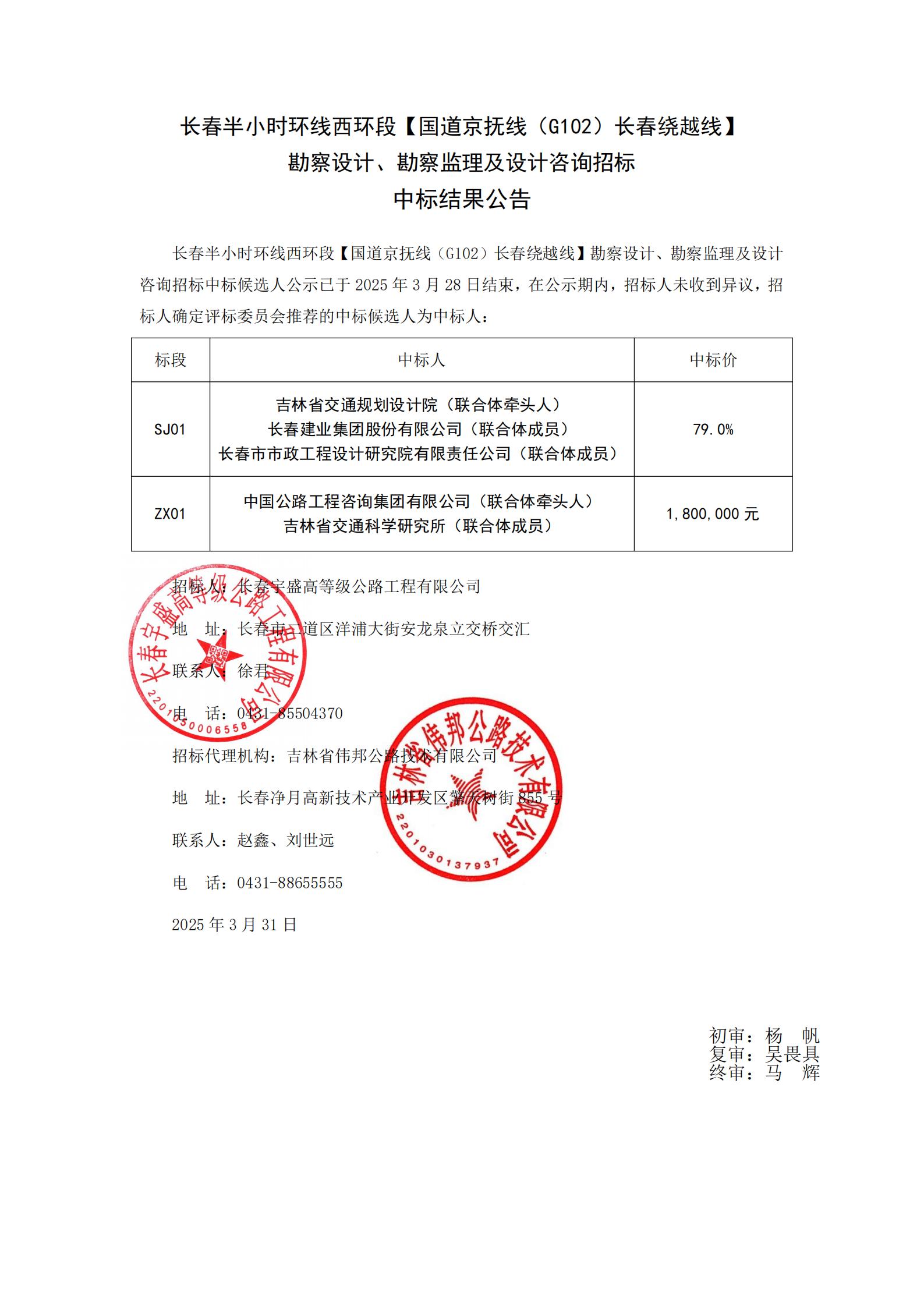 长春半小时环线西环段【国道京抚线(G102)长春绕越线】勘察设计、勘察监理及设计咨询招标中标结果公告