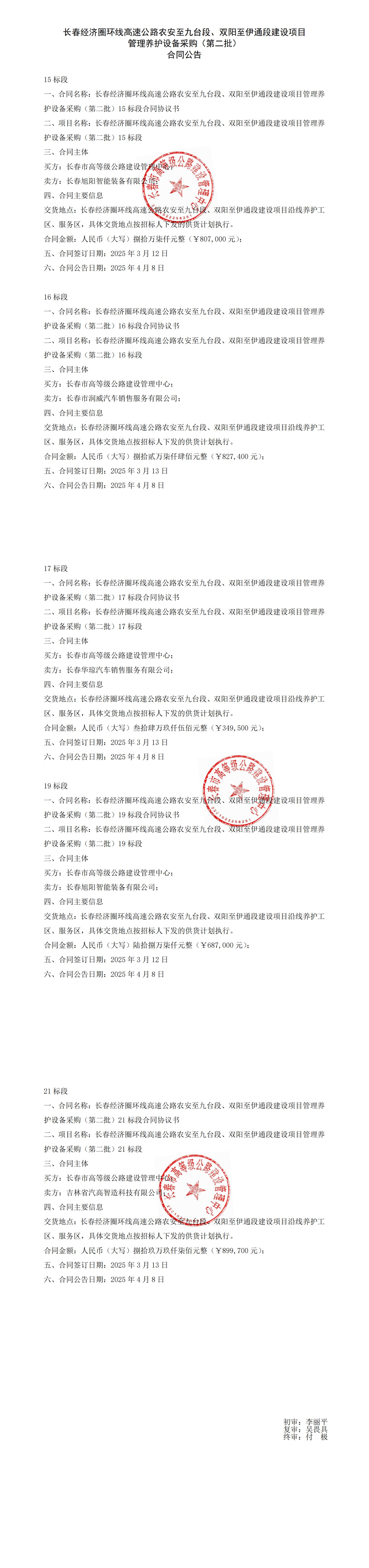 长春经济圈环线高速公路农安至九台段、双阳至伊通段建设项目管理养护设备采购(第二批) 合同公告