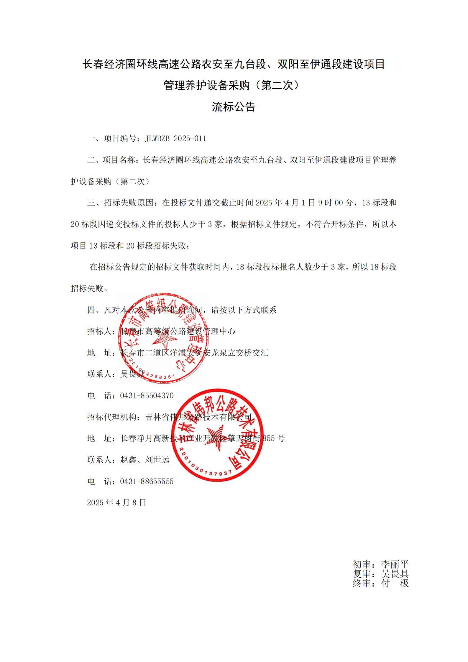 长春经济圈环线高速公路农安至九台段、双阳至伊通段建设项目管理养护设备采购(第二次) 流标公告