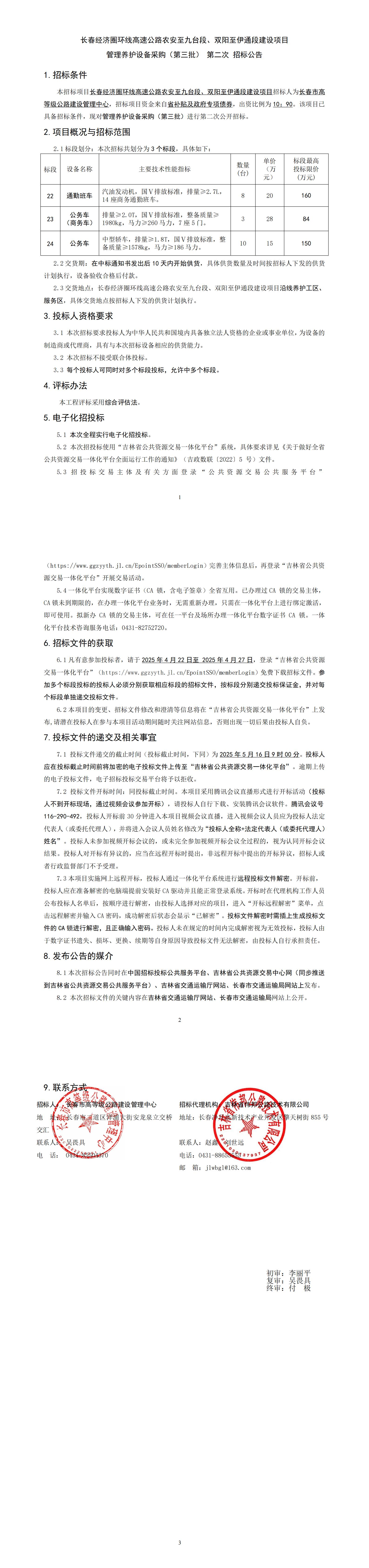 长春经济圈环线高速公路农安至九台段、双阳至伊通段建设项目管理养护设备采购(第三批) 第二次 招标公告
