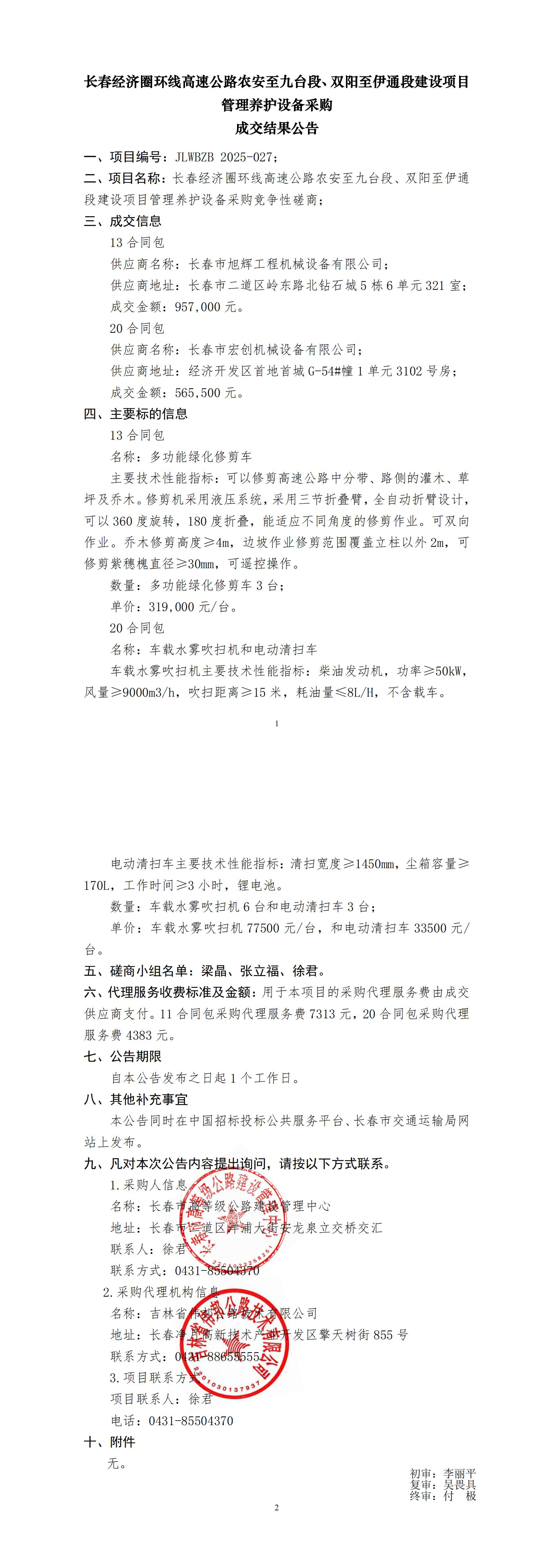 长春经济圈环线高速公路农安至九台段、双阳至伊通段建设项目管理养护设备采购成交结果公告
