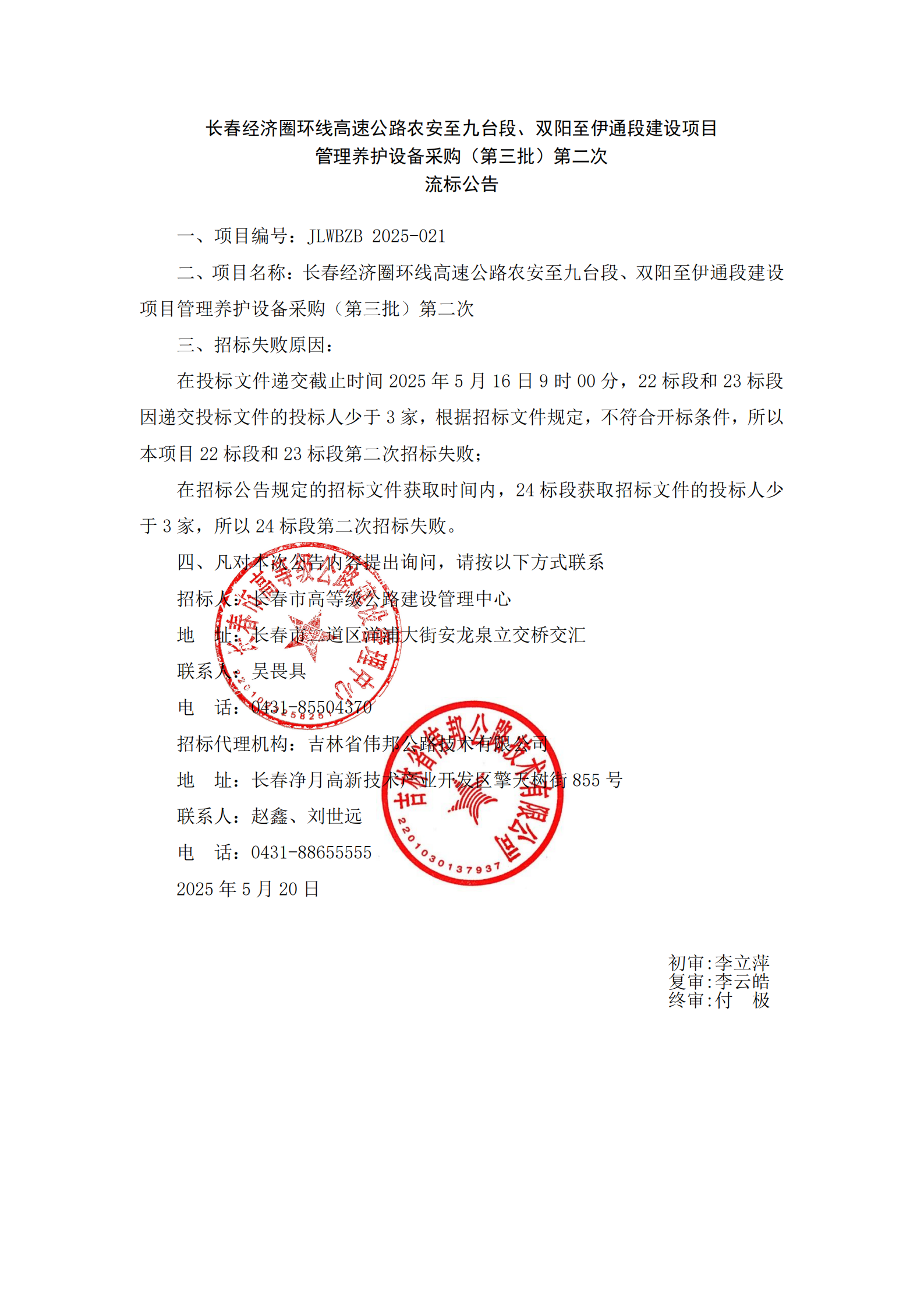 长春经济圈环线高速公路农安至九台段、双阳至伊通段建设项目管理养护设备采购(第三批)第二次 流标公告
