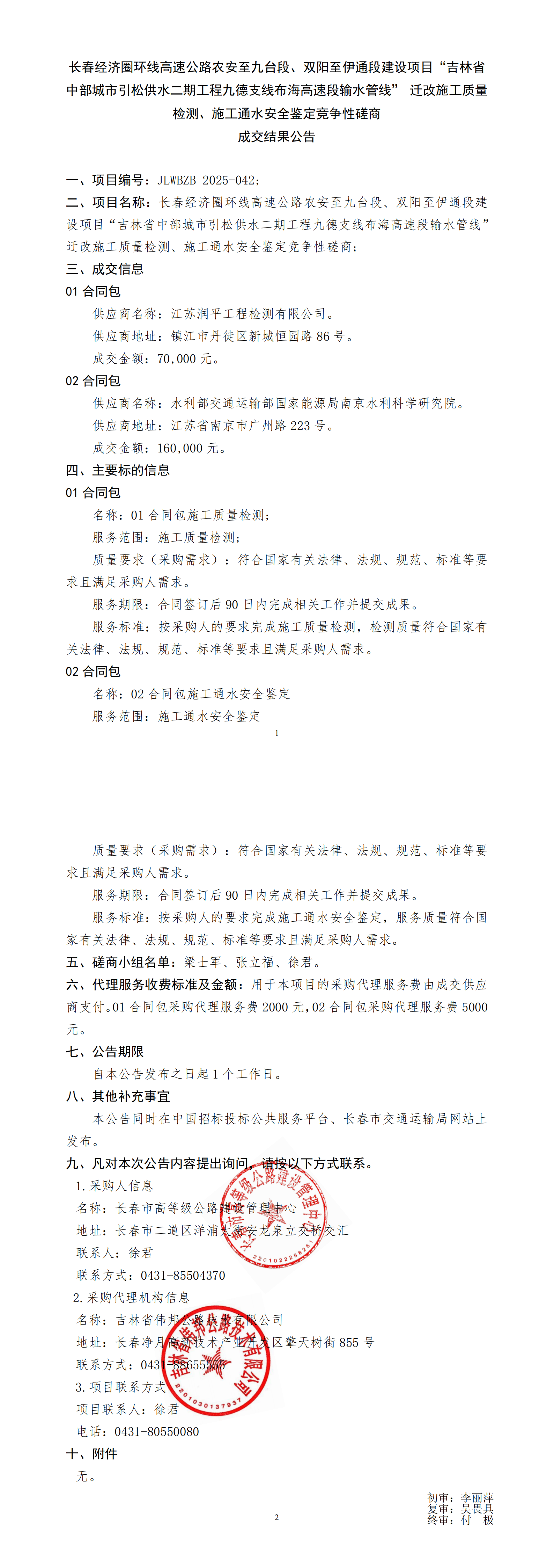 长春经济圈环线高速公路农安至九台段、双阳至伊通段建设项目“吉林省中部城市引松供水二期工程九德支线布海高速段输水管线”迁改施工质量检测、施工通水安全鉴定竞争性磋商 成交结果公告