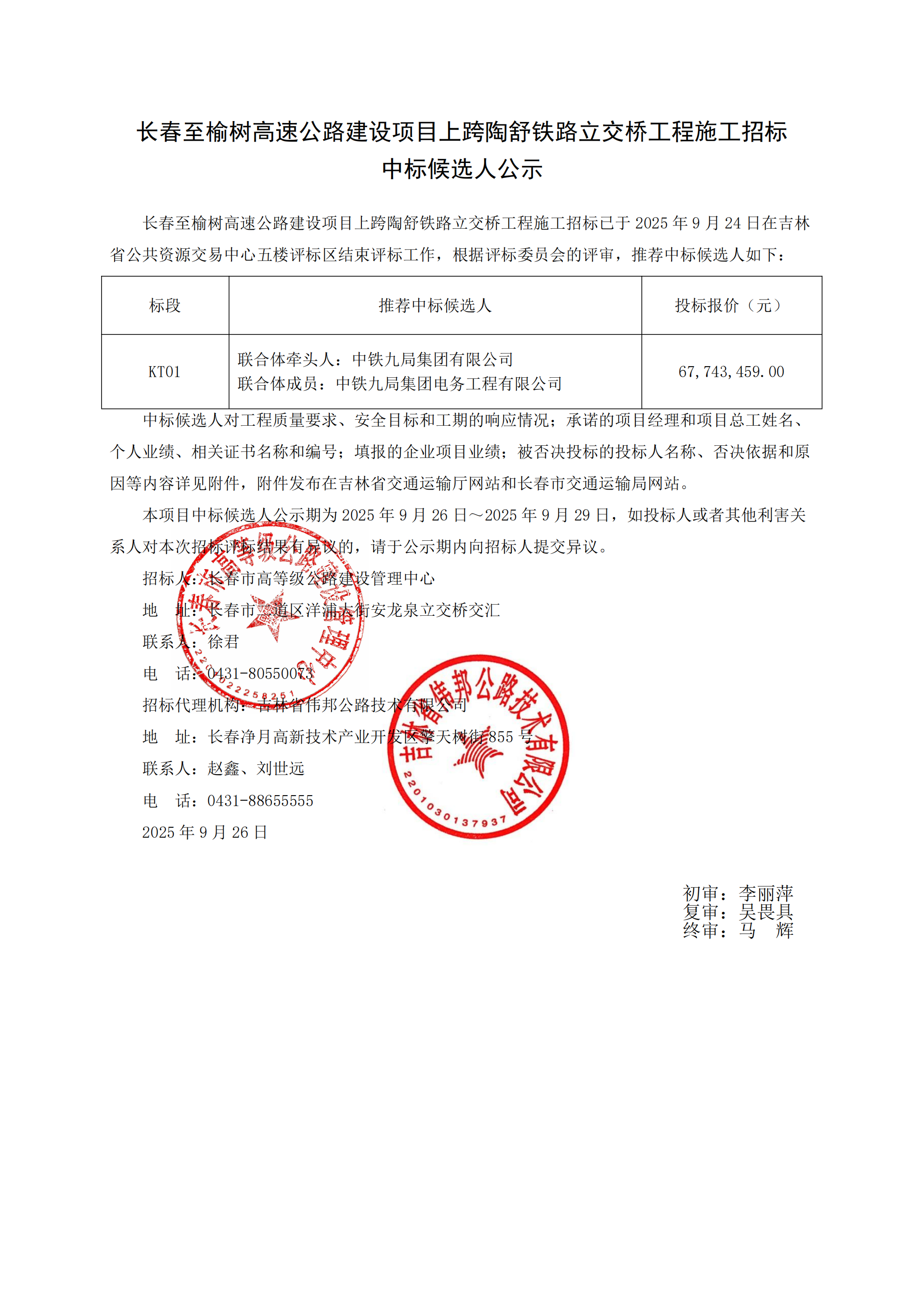 长春至榆树高速公路建设项目上跨陶舒铁路立交桥工程施工招标 中标候选人公示