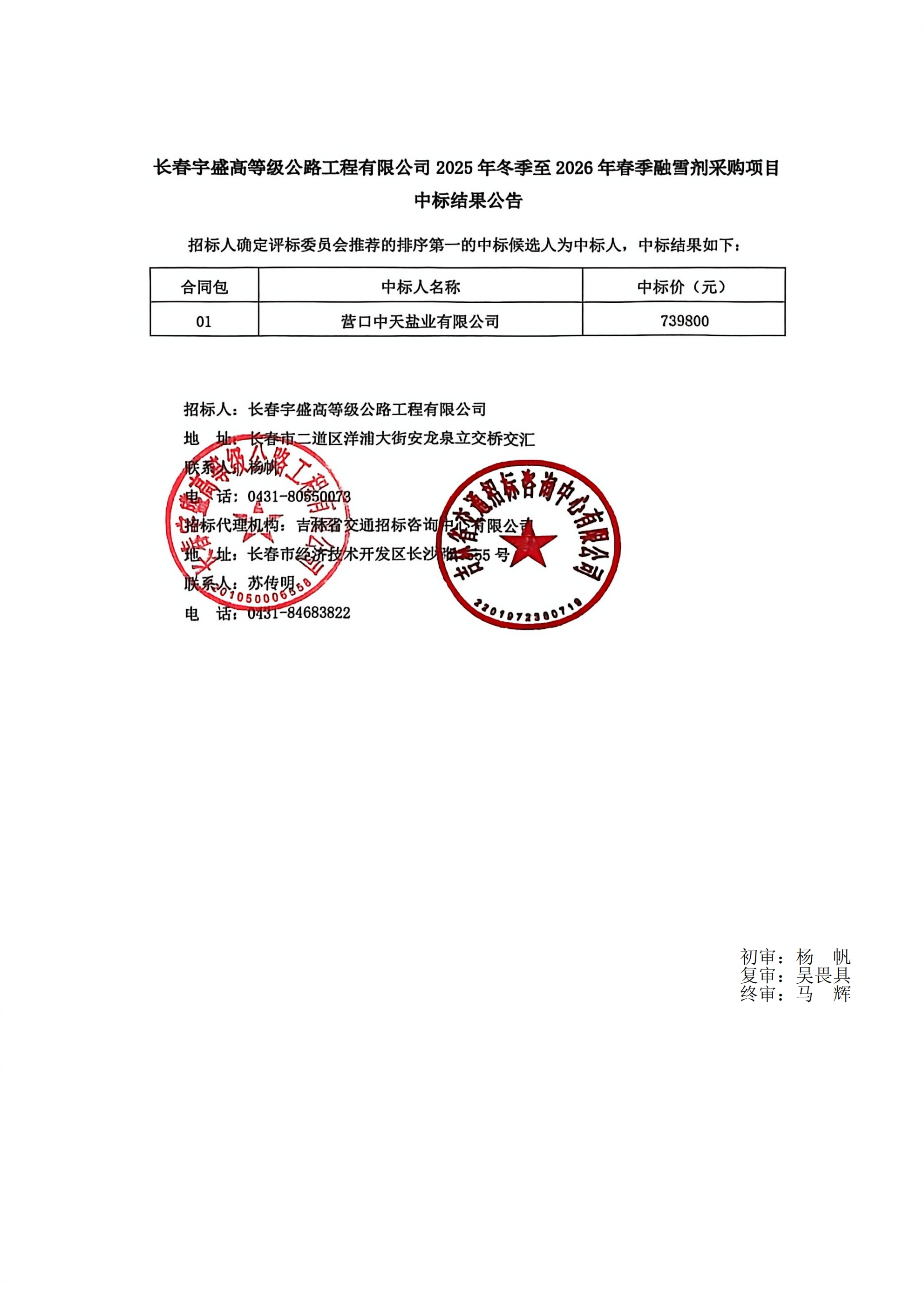 长春宇盛高等级公路工程有限公司2025年冬季至2026年春季融雪剂采购项目中标结果公告
