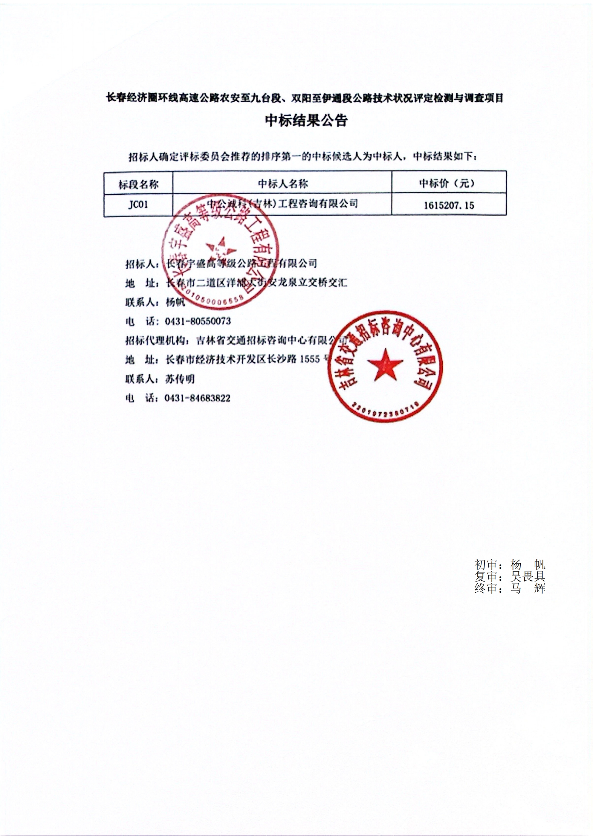 长春经济圈环线高速公路农安至九台段、双阳至伊通段建设项目公路技术状况评定检测与调查项目中标结果公告