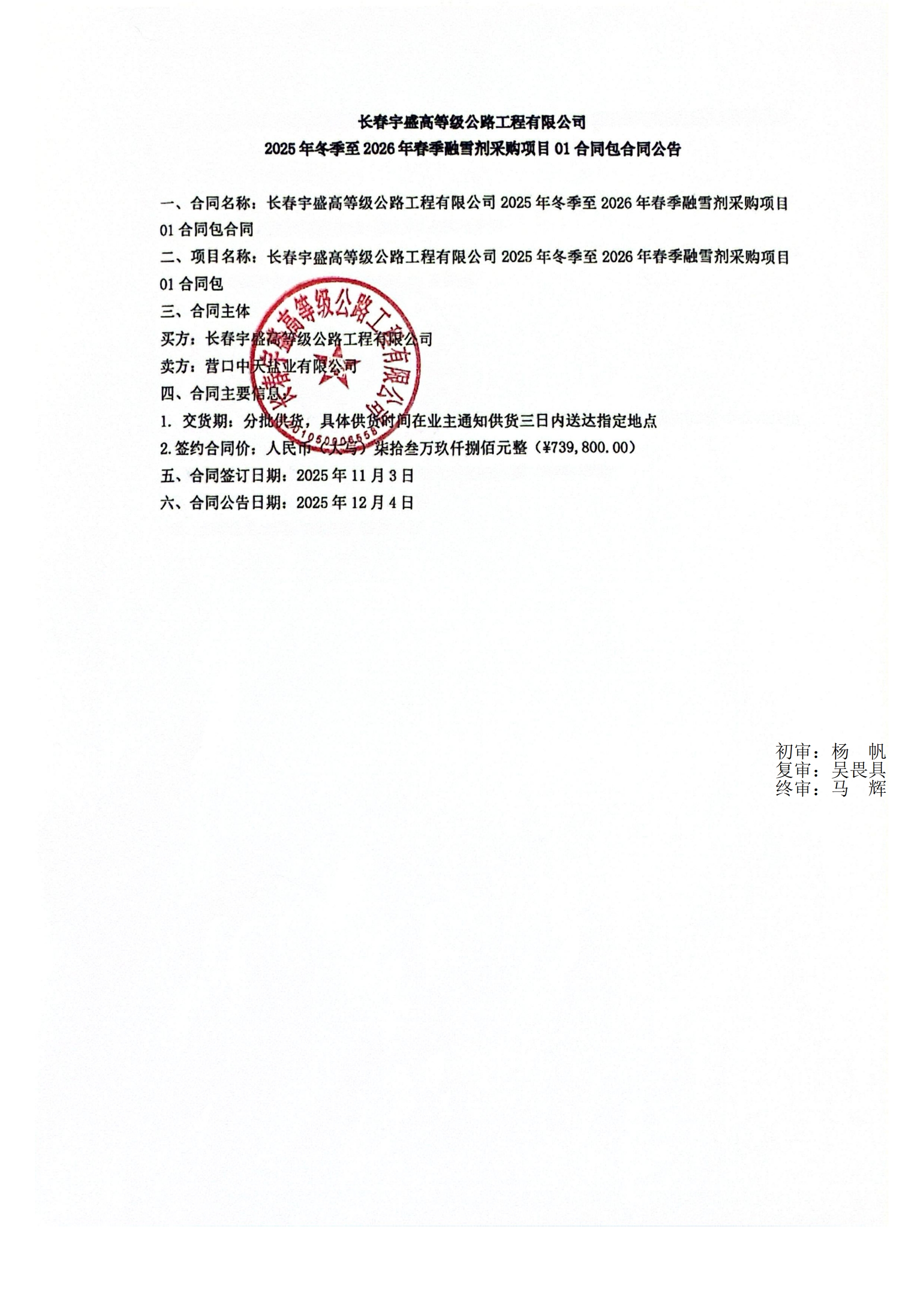 长春宇盛高等级公路工程有限公司2025年冬季至2026年春季融雪剂采购项目01合同包合同公告