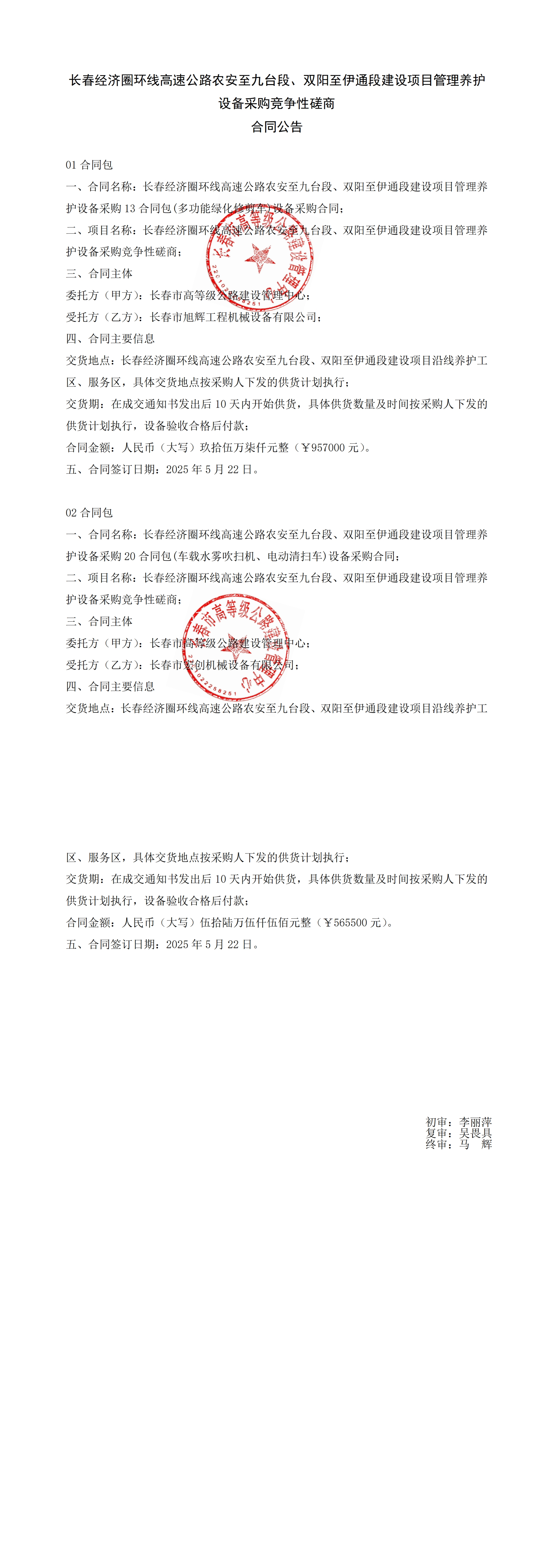 长春经济圈环线高速公路农安至九台段、双阳至伊通段建设项目管理养护设备采购竞争性磋商合同公告
