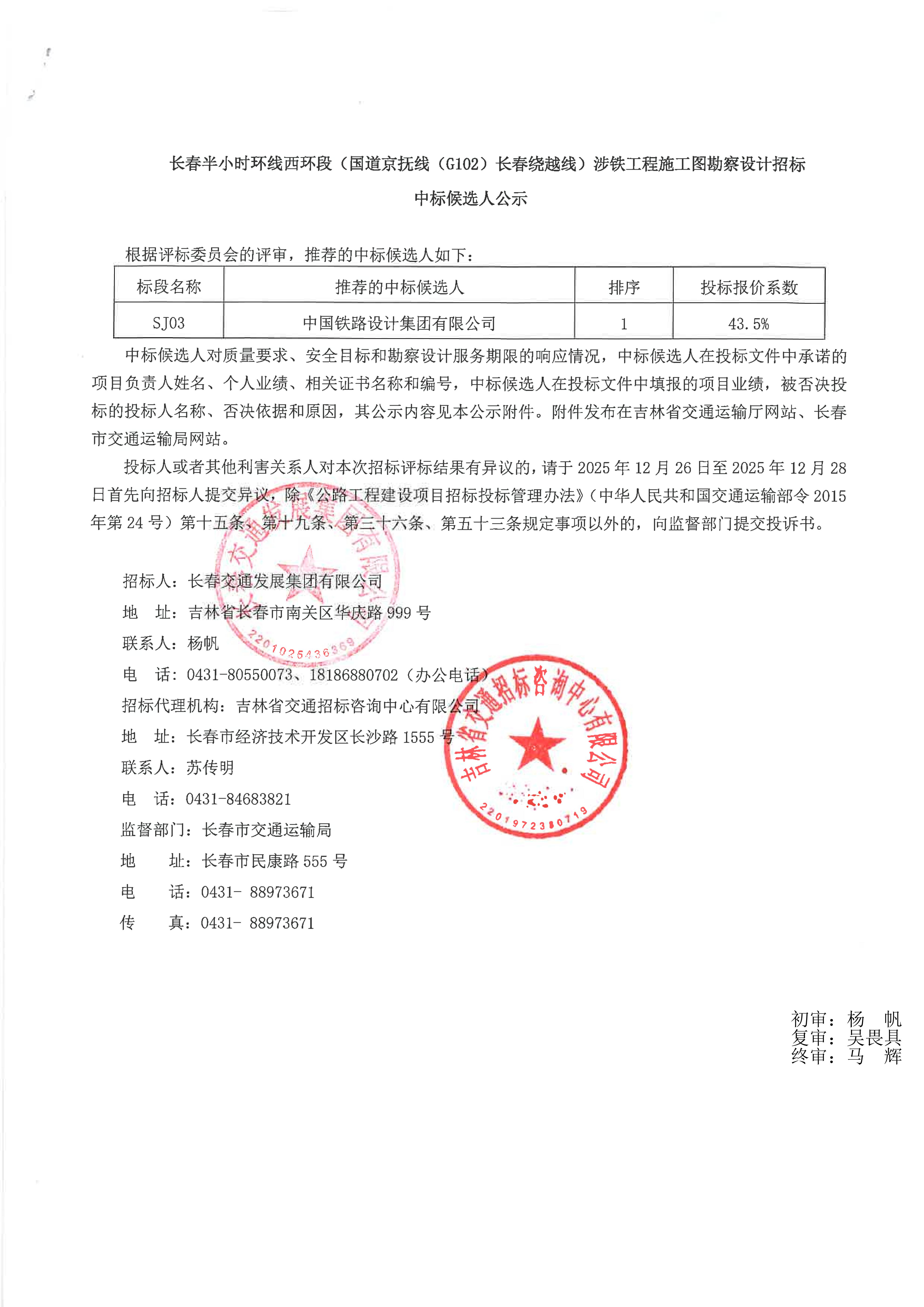长春半小时环线西环段(国道京抚线(G102)长春绕越线)涉铁工程施工图勘察设计招标中标候选人公示