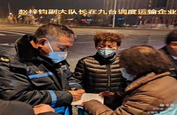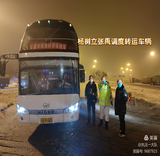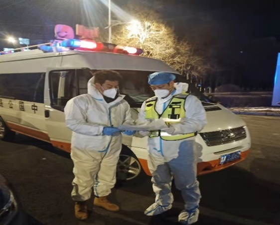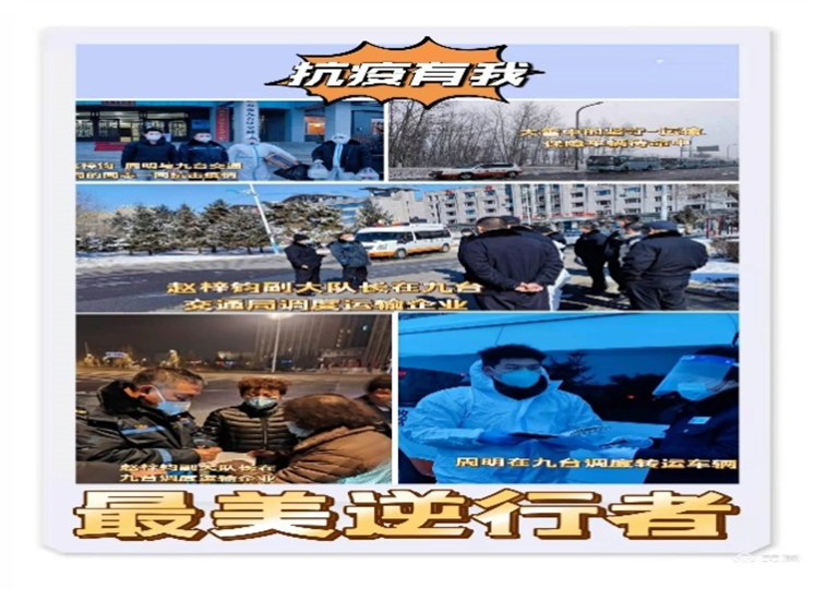 赵梓钧副大队长接到市交通运输局指令后,勇敢逆行,第一时间奔赴疫情最严重的九台区,主动担负起最艰巨的人员转运和运输保障任务,在长春和九台区之间筑起一条保畅保供的交通运转线,被称为抗击疫情“摆渡人”。他带领周明同志每天协调当地政府、社区等疫情防控部门,确定转运人员数量,调度运输企业和车辆,由于工作任务繁重,转运任务随机性强,不分昼夜应对各种紧急任务,每天只能借转运间隙在车中短暂休息。高强度工作导致过度疲劳,又加上连续雨雪天气,气温骤降,他们穿得太少,两位同志已经双眼通红、嗓子沙哑的说不出话来。即使这样他们也没有退缩,像勇士一样,在这场没有硝烟的战争中,顶风冒雪、通宵达旦,将个人安危抛在脑后,坚守在九台抗“疫”第一线。
