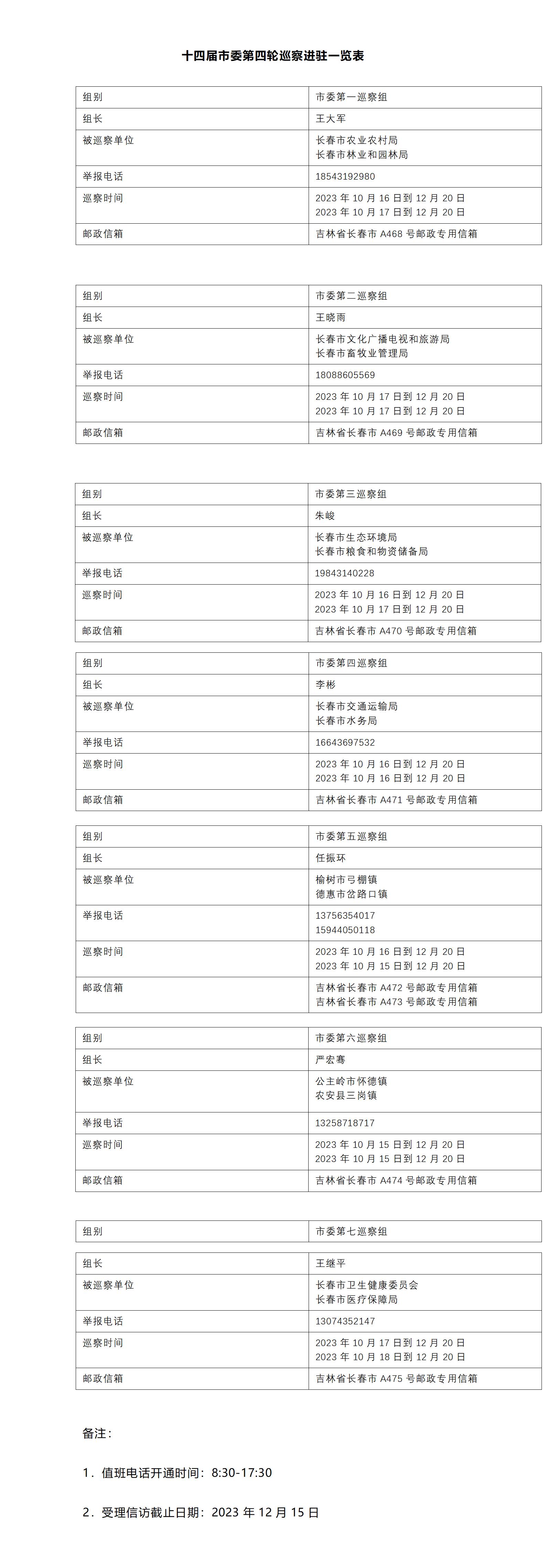 据悉,7个市委巡察组将在被巡察单位工作2个月时间,巡察期间设立信访举报电话和邮政信箱,主要受理反映被巡察单位领导班子及其成员、下一级党组织主要负责人和重要岗位领导干部问题的来信来电来访,重点是关于违反政治纪律、中央八项规定精神、组织纪律、廉洁纪律、群众纪律、工作纪律和生活纪律以及巡察整改等方面的问题反映。巡察组受理信访时间截止到2023年12月15日。