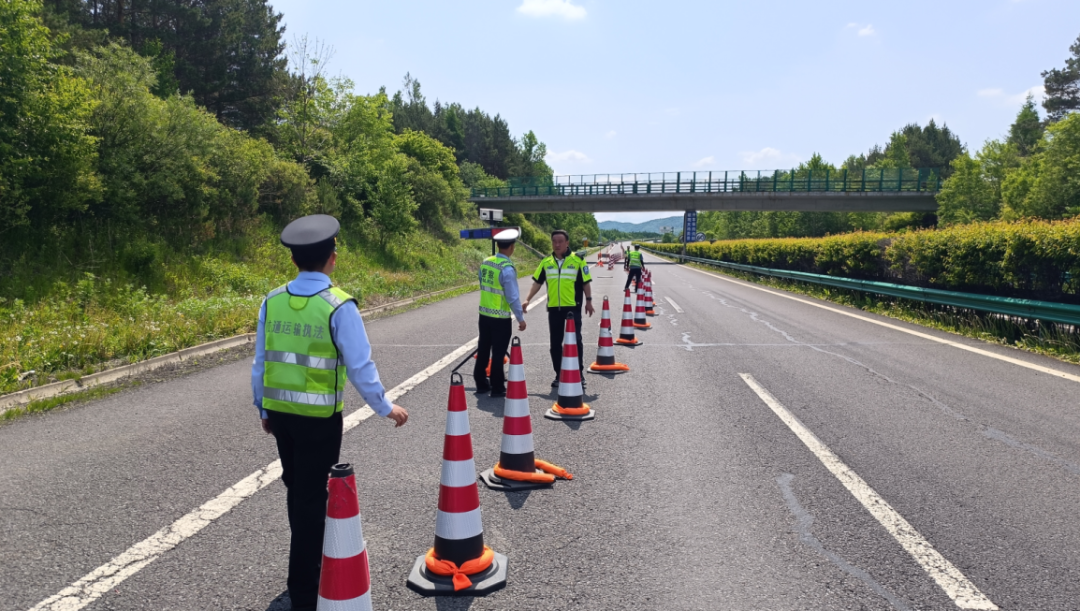 省交通执法局靖宇分局执法人员对青龙河大桥涉路施工点的交通安全防护设施、施工现场安全设施设置以及个人安全防护等情况进行检查,并对查出的问题做了现场督促整改,确保高速公路安全、有序、畅通。