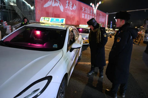现场引导近200台巡游出租车在冰雪新天地门前蓄车,为游客提供多样化出行选择。