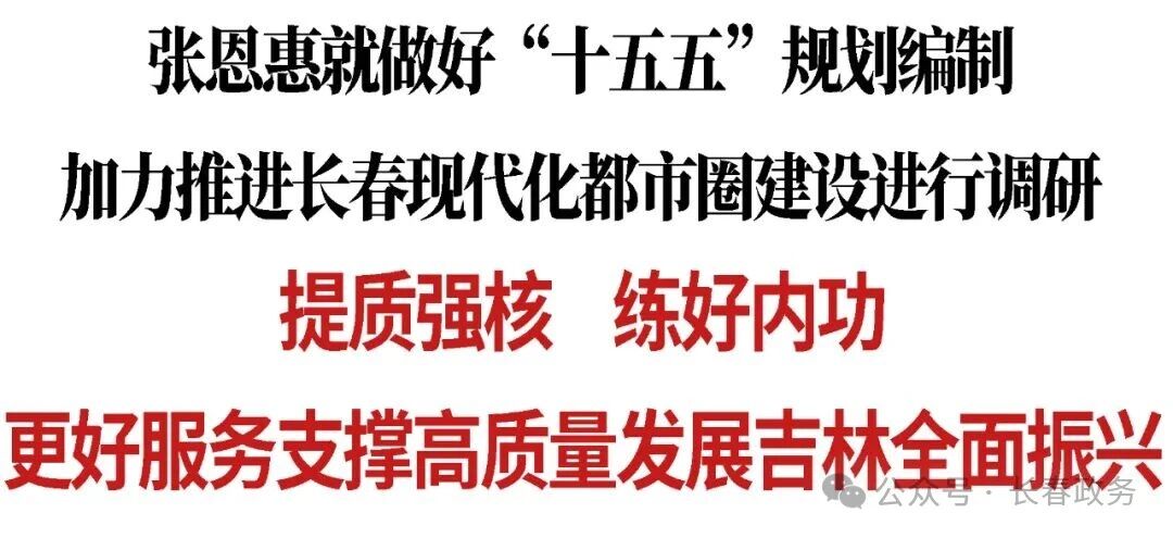 10月22日,市委书记张恩惠就做好我市“十五五”规划编制,加力推进长春现代化都市圈建设进行调研,强调要深入贯彻习近平总书记关于吉林工作的系列重要指示精神,落实省委省政府工作部署,在提质强核、练好内功上持续用力,推动东部生态价值转化实践区建设,更好服务支撑高质量发展、吉林全面振兴取得新突破。