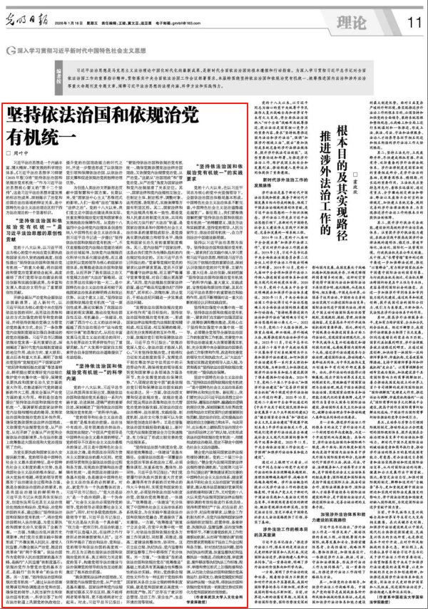 习近平法治思想是一个内涵丰富、博大精深、不断发展的科学理论体系。《习近平法治思想学习纲要(2025年版)》将“坚持依法治国和依规治党有机统一”作为习近平法治思想核心要义的“第十二个坚持”,这是习近平法治思想丰富发展的标志性成果,深刻揭示了治党和治国在法治场域的辩证关系,是中国特色社会主义法治理论区别于西方法治理论的一个显著标识。